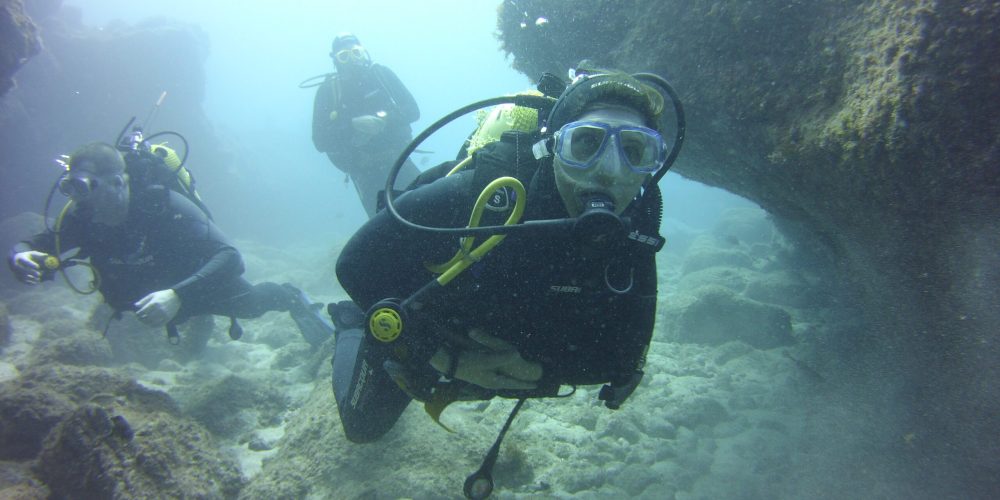 Der Einstieg ist recht einfach und beginnt im Flachwasser. Nach ca. 20 Metern kommt ein Absatz wo wir uns auf ca. 6 Meter fallen lassen. Dann geht es erstmal einige Minuten über einen steinigen Untergrund, wo wir häufig auf Papageifische und Kraken treffen. Nach einer weile kommt dann eine kleine Steilwand, an der wir auf ca. 12 Meter runter gehen. Die Wand besteht aus Natursteinen und wirkt, als ob sie von Menschenhand erbaut wurde. Sie zieht sich entlang an einem schneeweißen Sandboden.